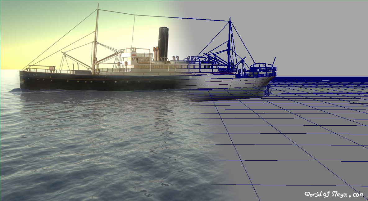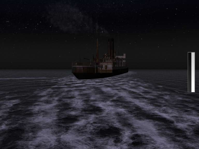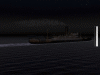NURBS surfaces were used for the ship. All parts had two different tessellation settings for near and far shots. For the whole building process, an image (constructed out of available pictures and sketches) was used as reference to build the ship. This map afterwards was the base for the texture. The texture was an simple projection over nearly all objects.